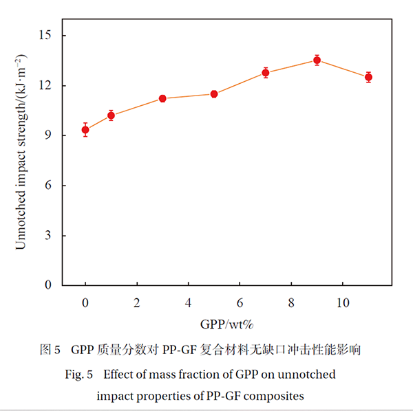 圖5顯示,隨著GPP添加量從0wt%增加至9wt%,無缺口沖擊性能逐步提升,最佳效果出現(xiàn)在9wt%處,隨后略有下降。這表明GPP有效改善了玻璃纖維與聚丙烯的界面相容性,提升了復(fù)合材料的抗撞擊能力。但過量添加GPP會削弱聚丙烯分子鏈間的相互作用,導(dǎo)致沖擊性能下降。