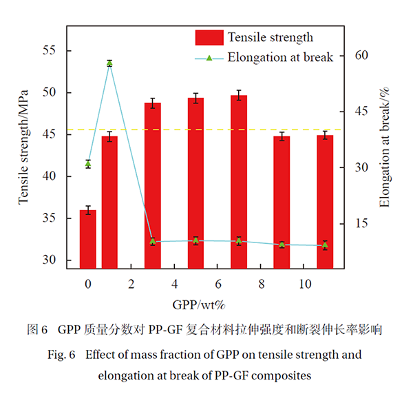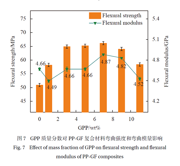圖7顯示,隨著GPP含量的增加,PP-GF復(fù)合材料的彎曲強(qiáng)度和彎曲模量持續(xù)上升,直至7wt%時達(dá)到最優(yōu)。這歸因于GPP增強(qiáng)了界面強(qiáng)度,穩(wěn)定了玻璃纖維在聚丙烯基體中的分布,從而提高了復(fù)合材料的承載性能。然而,GPP含量超過7wt%后,聚丙烯分子鏈間的相互作用減弱,導(dǎo)致彎曲強(qiáng)度下降。