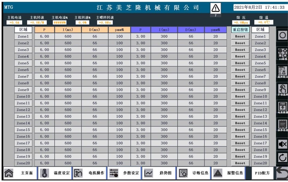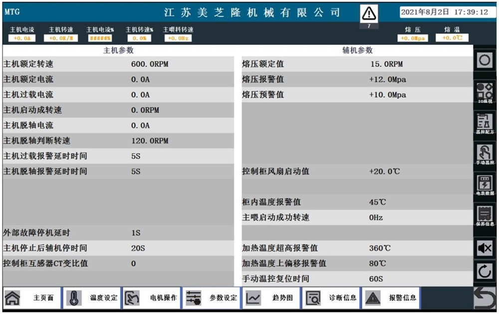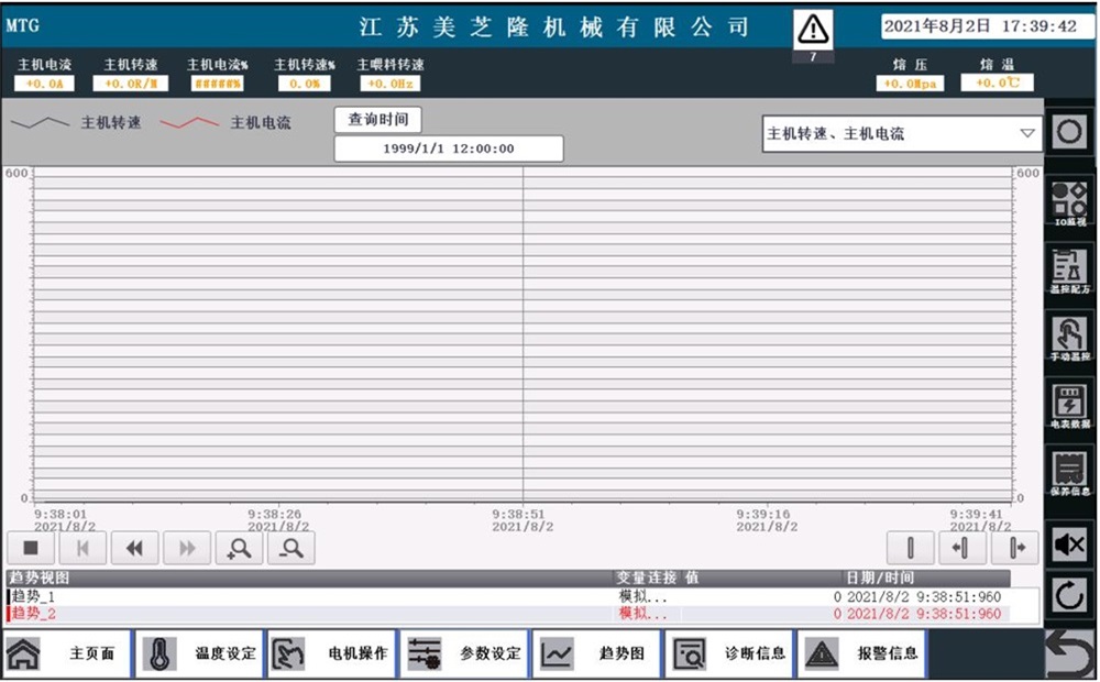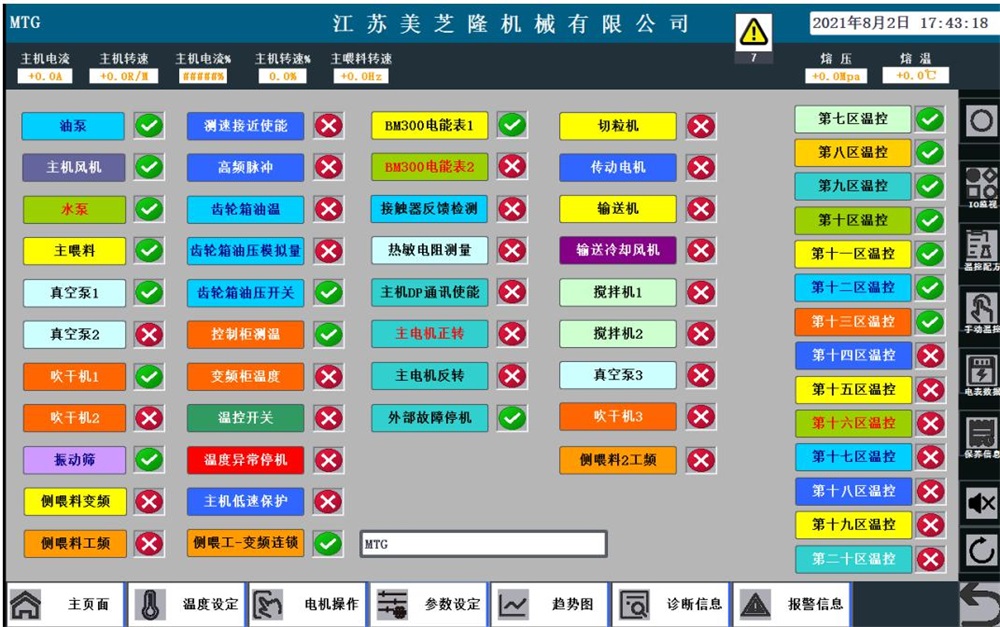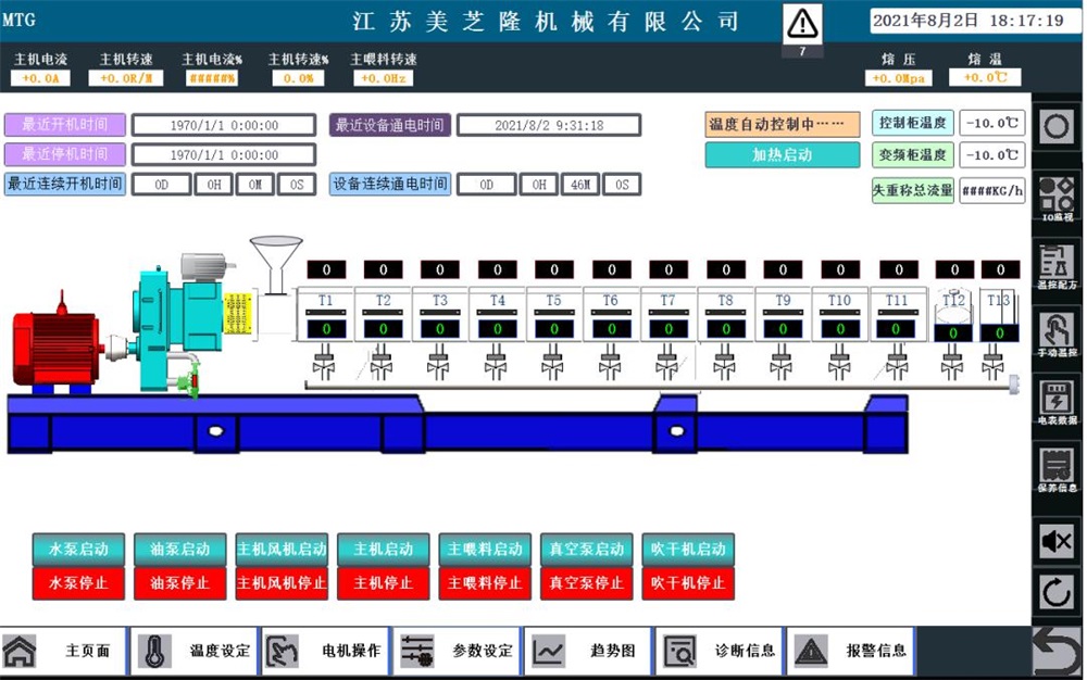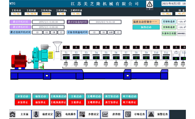 ● 在主機(jī)觸摸屏上監(jiān)控主機(jī)轉(zhuǎn)速、主機(jī)電流、各段溫控設(shè)定值和實(shí)際值、熔體壓力實(shí)際值等,并有動(dòng)態(tài)曲線(xiàn)顯示、參數(shù)輸入、參數(shù)保存;故障報(bào)警優(yōu)先顯示,報(bào)警信息可記錄和調(diào)閱