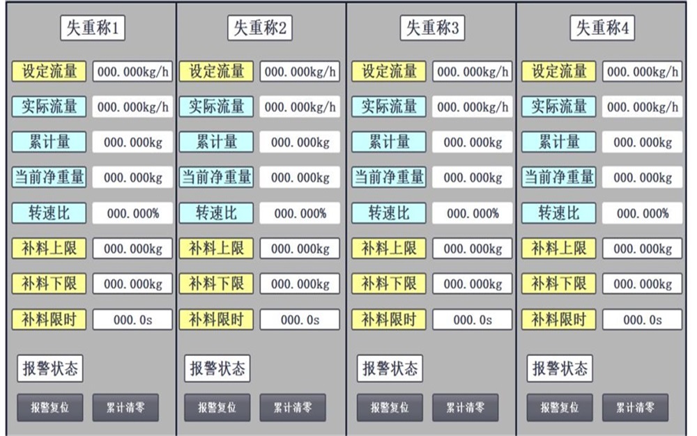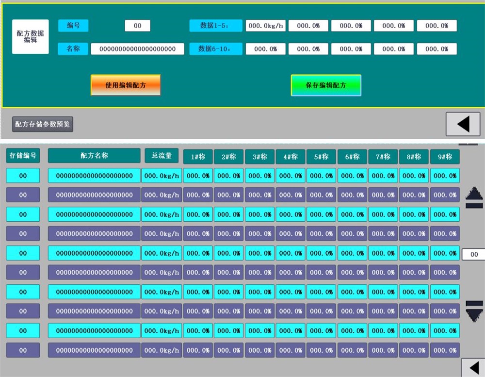 ● 具備物料配方管理功能,在觸摸屏上可調(diào)用、增加生產(chǎn)配方,生產(chǎn)人員只需要選取生產(chǎn)的配方號(hào),輸入生產(chǎn)小時(shí)產(chǎn)量,就能自動(dòng)計(jì)算出需要參與的每臺(tái)稱(chēng)的運(yùn)行參數(shù),并把以上數(shù)據(jù)給予對(duì)應(yīng)的失重稱(chēng),實(shí)現(xiàn)一鍵開(kāi)機(jī)。