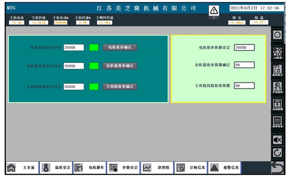 ● 實(shí)際統(tǒng)計(jì)擠出機(jī)開(kāi)機(jī)時(shí)間和運(yùn)行時(shí)間,減速箱、主電機(jī)、控制柜按運(yùn)行時(shí)間,達(dá)到保養(yǎng)維護(hù)周期后及時(shí)提醒設(shè)備維護(hù)人員對(duì)相應(yīng)設(shè)備進(jìn)行維護(hù)